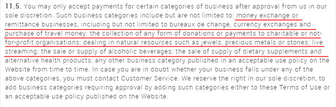 - в п. 11.5 клиентского соглашения Skrill сообщает, что некоторые категории платежей клиент может принимать только после одобрения со стороны платежной системы. К таким направлениям относятся сбор пожертвований, торговля природными ресурсами, поставка некоторых групп товаров, например, алкоголя. При нарушении этого требования возможен штраф в 150€ и обращение в правоохранительные органы;