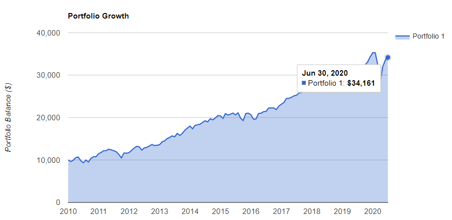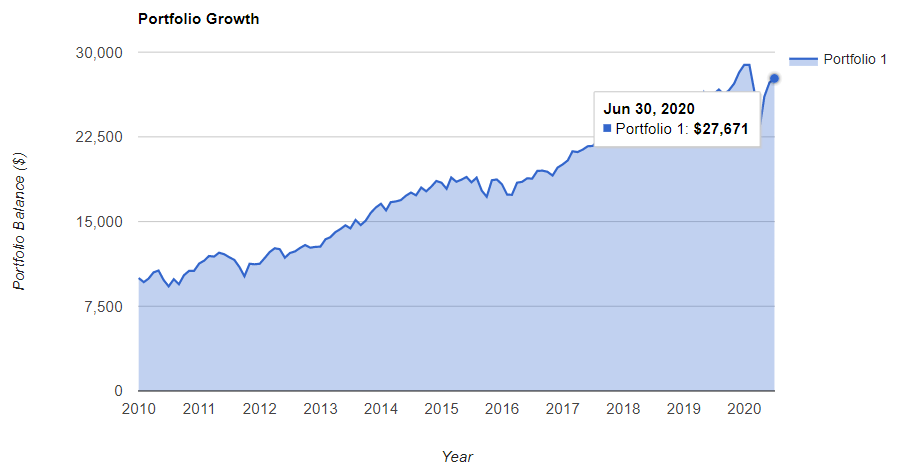 Для удобства работаем с ETF SPY, это старейший ETF фонд, работает с 1993 г. и уже привлек в управление сотни миллиардов долларов. Без учета дивидендов доход за период с начала 2010 г. по июнь 2020 г. составил 176,71%. Стартовые $10000 превратились в $27671.