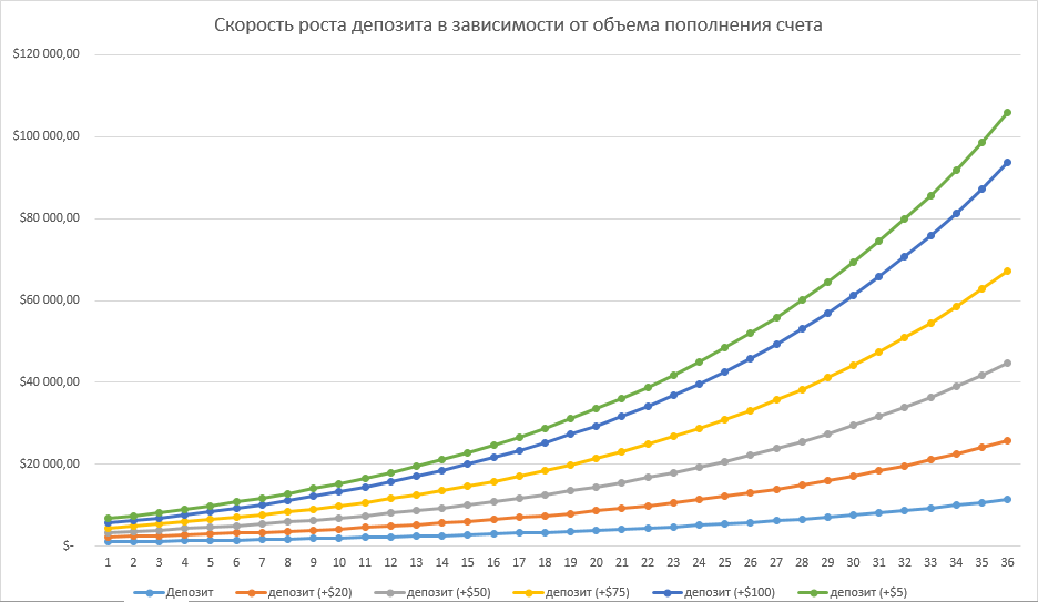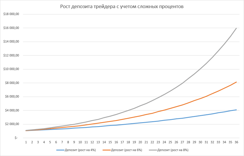 В этом примере речь идет об усредненных показателях. Трейдинг связан с неопределенностью, один месяц может дать прибыль в 2%, другой – убыток в 1%, а третий – прибыль в 10-20%. Так что реальные кривые роста с учетом сложных процентов будут иметь несколько иной вид.