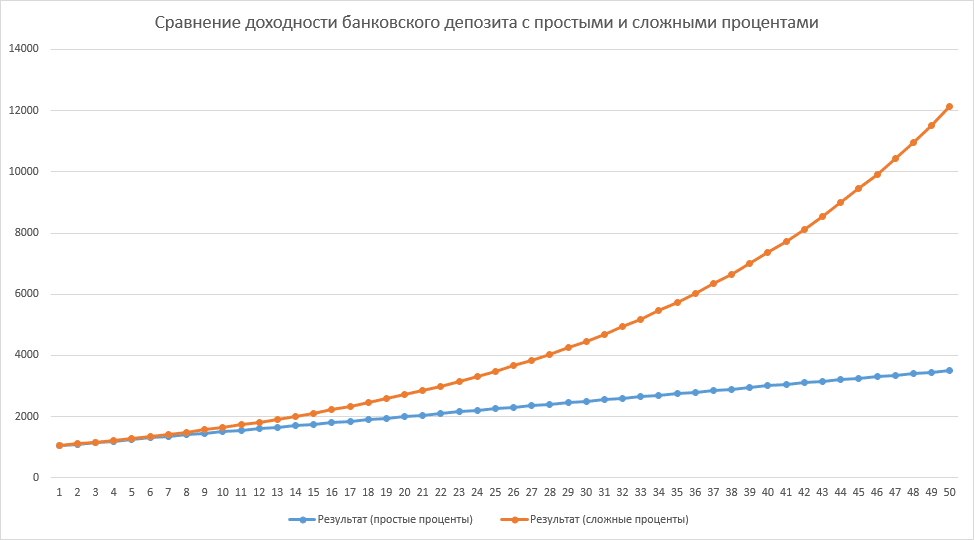 Чем больше проходит времени, тем большим становится разрыв между депозитом с простыми и сложными процентами. К 50 году разница между этими вариантами достигнет $8619,38.