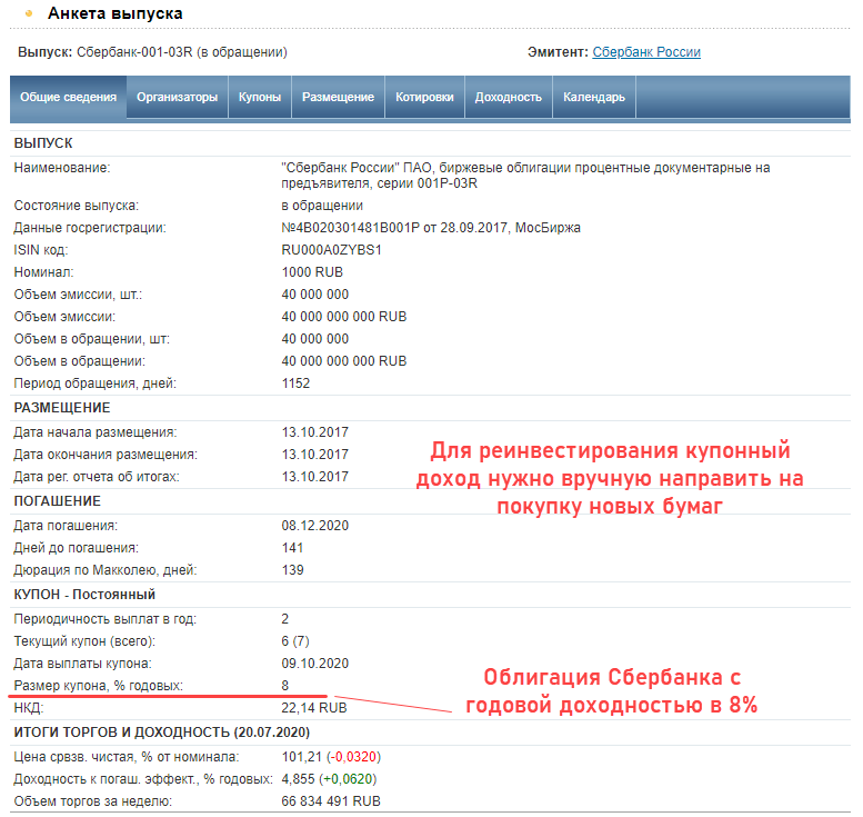 После завершения срока обращения облигации эмитент погашает ее, выплачивая держателю сумму, равную номиналу. Здесь реализация этой схемы предполагает трату купонного дохода на покупку новых облигаций. Увеличивается число бумаг в портфеле, что повышает его доходность в деньгах. Таким образом здесь и применяется сложный инвестиционный процент.