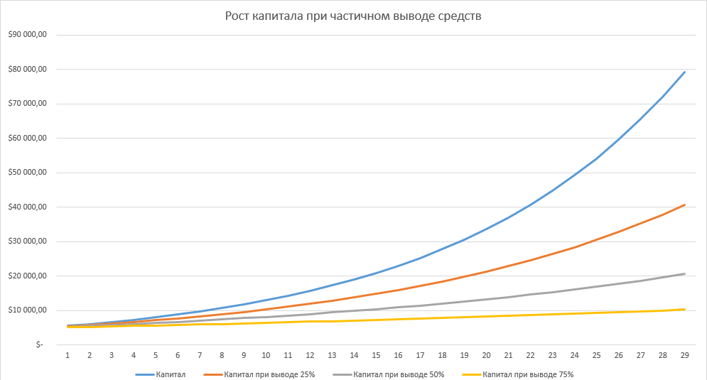 Единственное решение проблемы – компромисс. Правда, это снизит рост капитала, чем больше выводите, тем медленнее идет рост капитала: