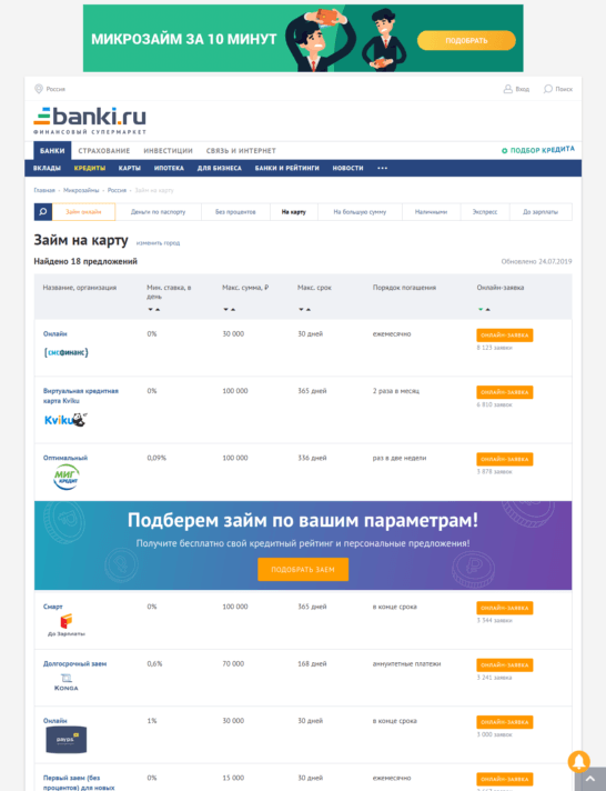 Ниже – пример такого сайта-агрегатора и список предложений с выдачей кредита на банковский пластик.