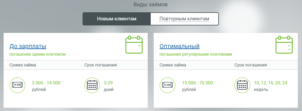 - при первом займе максимум ограничен 75000 рублей; есть ограничения по типам займов, нельзя просто брать любые деньги в долг на удобный срок. Здесь предлагают либо кредит «До зарплаты» с обязательным сроком погашения 3-30 дней и суммой в пределах 3000-14000 рублей. Другой вариант называется «Оптимальный», МФО готова выдать вам