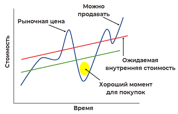 Стоимостное инвестирование предполагает поиск недооцененных акций, в портфель включаются бумаги, торгующиеся ниже внутренней стоимости. Сила бренда отходит на второй план, ключевое при выборе – устойчивость бизнеса и недооцененность акций. Одна из причин такого явления – излишне эмоциональная реакция рынка на негативные новости. Со временем это расхождение нивелируется, а инвесторы зарабатывают на этом росте.