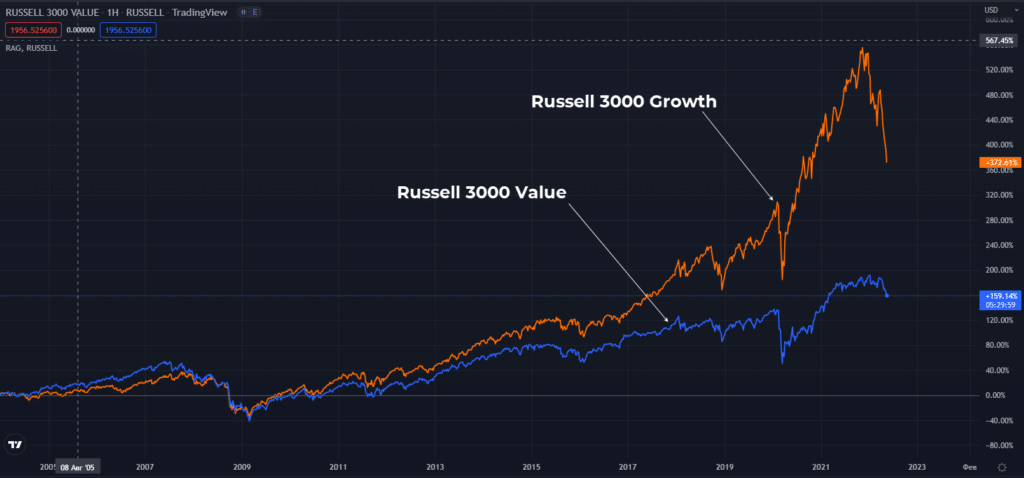В нашем примере с индексами стоит отметить величину падения в 2022 г. Russell 3000 Growth рухнул на 30%, а Russell 3000 Value – на 13-14%. В целом, стоимостное инвестирование работает, но на дистанции в несколько лет оно действительно может дать меньший доход по сравнению с портфелем из growth stocks.