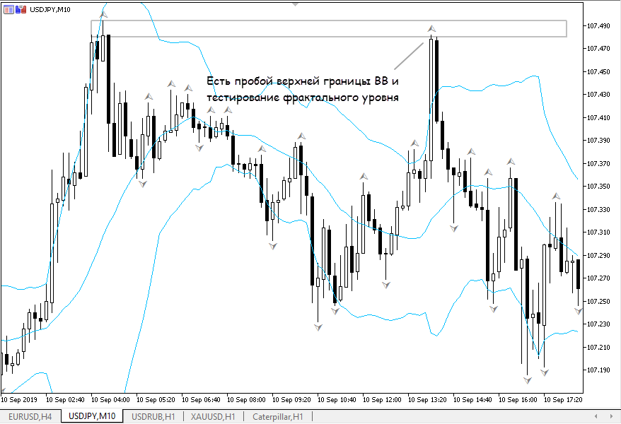 - начинаем с таймфрейма М10, на него добавляем полосы Боллинджера. Нам нужно импульсное движение и закрытие свечи за верхней границей канального индикатора;