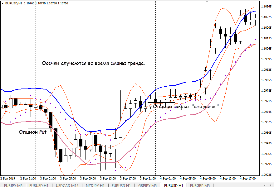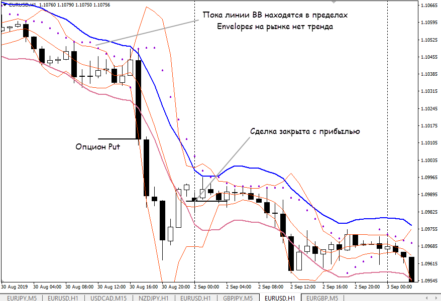 С опционами Call в этой стратегии Боллинджера для бинарных опционов работаем по зеркальным правилам:
