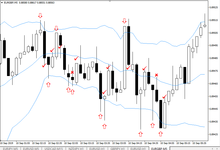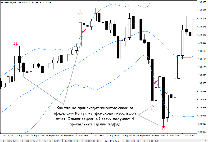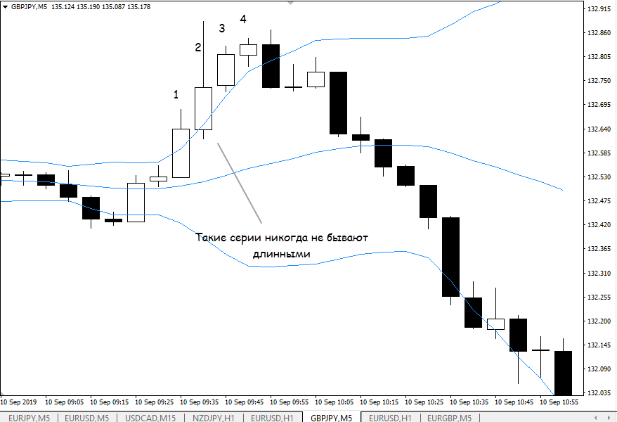 - следующий прием напоминает предыдущий – ловим откат после импульсного движения. Отличие в том, что нас интересуют серии свечей, которые подряд закрывались за пределами полос Боллинджера. Придется поработать со статистикой на истории. Если установите, например, что в 80% случаев после 4-й подряд свечи начинается откат, ищите такие серии и на закрытии 4-1 по счету свечи открывайте сделки в противоположном импульсу направлении. Если серия продолжится, можно использовать агрессивный мартингейл, вряд ли серия убыточных сделок будет длинной.