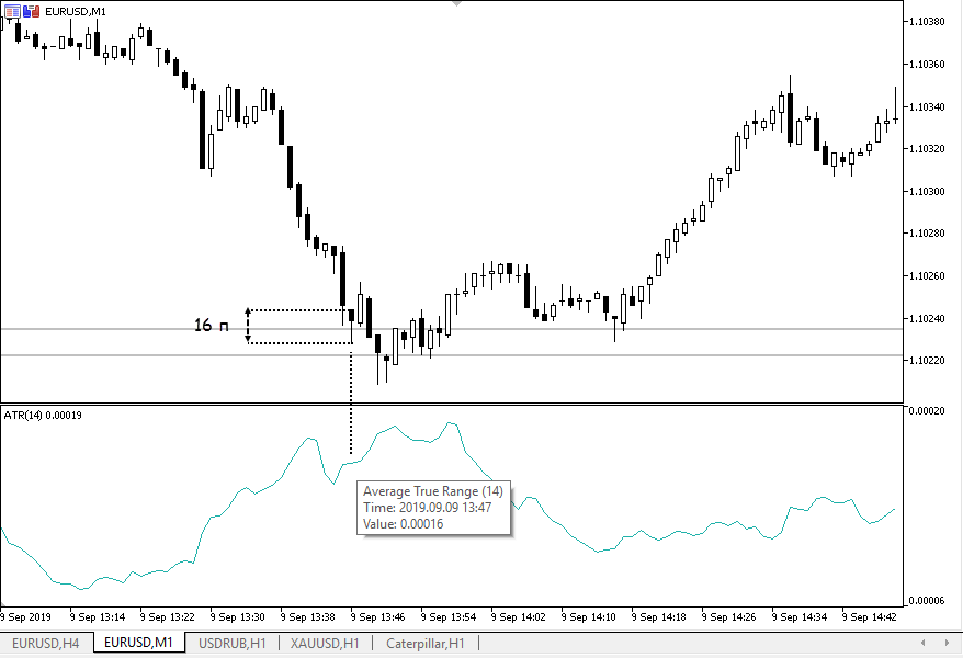 - переходим на таймфрейм М1, здесь работаем с индикатором ATR. Сравниваем диапазон свечи, на которой произошло тестирование фрактального уровня и показания ATR. Диапазон свечи должен быть больше или равным ATR, это указывает на то, что импульс был достаточной силы;
