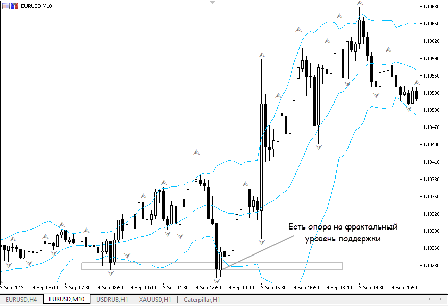 - на этом же таймфрейме проверяем фрактальные уровни. Свеча, вышедшая за пределы ВВ, должна опираться на него. Уровни ищем с начала текущего дня. Индикатор фракталов отмечает много локальных High, Low, нас интересуют уровни, соответствующие явно видимым вершинам и впадинам;
