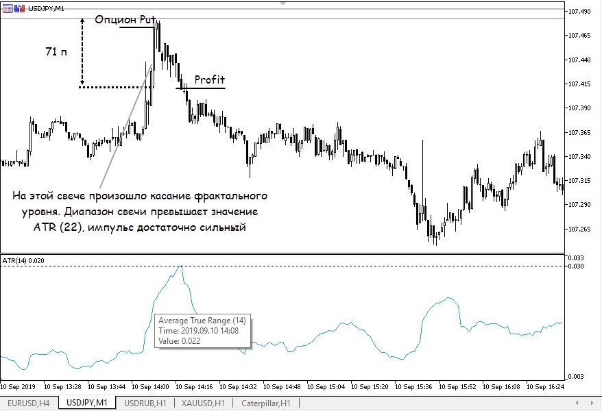 - на минутном графике сравниваем значение индикатора ATR и диапазон сигнальной свечи (на ней произошло касание фрактального уровня);