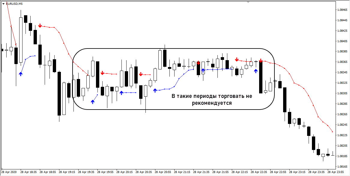 В периоды жесткого флета, когда график движется в коридоре шириной 10-20 пунктов, лучше не торговать. Сигналы поступают часто, но их качество оставляет желать лучшего.