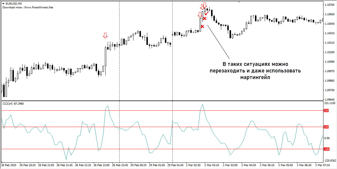 Изредка даже после выхода линии CCI в одну из зон разворот происходит не сразу. Если депозит позволяет, в такие периоды можно аккуратно использовать мартингейл. Обычно уже на 3-4 сделке происходит разворот, и все убытки окупаются.