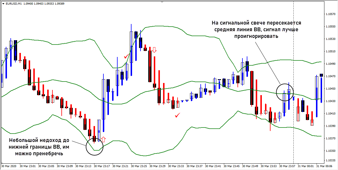 - если сигнал формируется с небольшим недоходом графика до границы полос Боллинджера, его можно брать в работу. Для страховки несколько снизьте ставку;