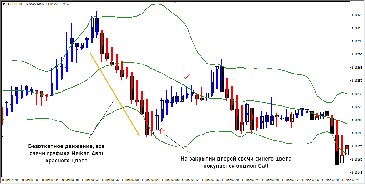 В стратегиях для бинарных опционов на 5 минут используются в том числе и стандартные торговые приемы, например, работа на отбой от границ канала. В этой системе в роли динамического канала используются полосы Боллинджера, а для смягчения ценового шума применен индикатор Heiken Ashi. Торговля ведется на минутном графике, поэтому без сглаживания ценовых колебаний не обойтись.