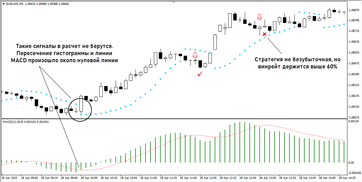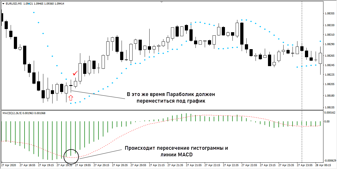 - как только произошло пересечение проверяем фильтр по Параболику. Маркер индикатора должен либо только переместиться под график (для опционов Call), либо уже быть под ним. Сигнал по Параболику должен сформироваться не позже 2 свечей до пересечения линий на MACD.