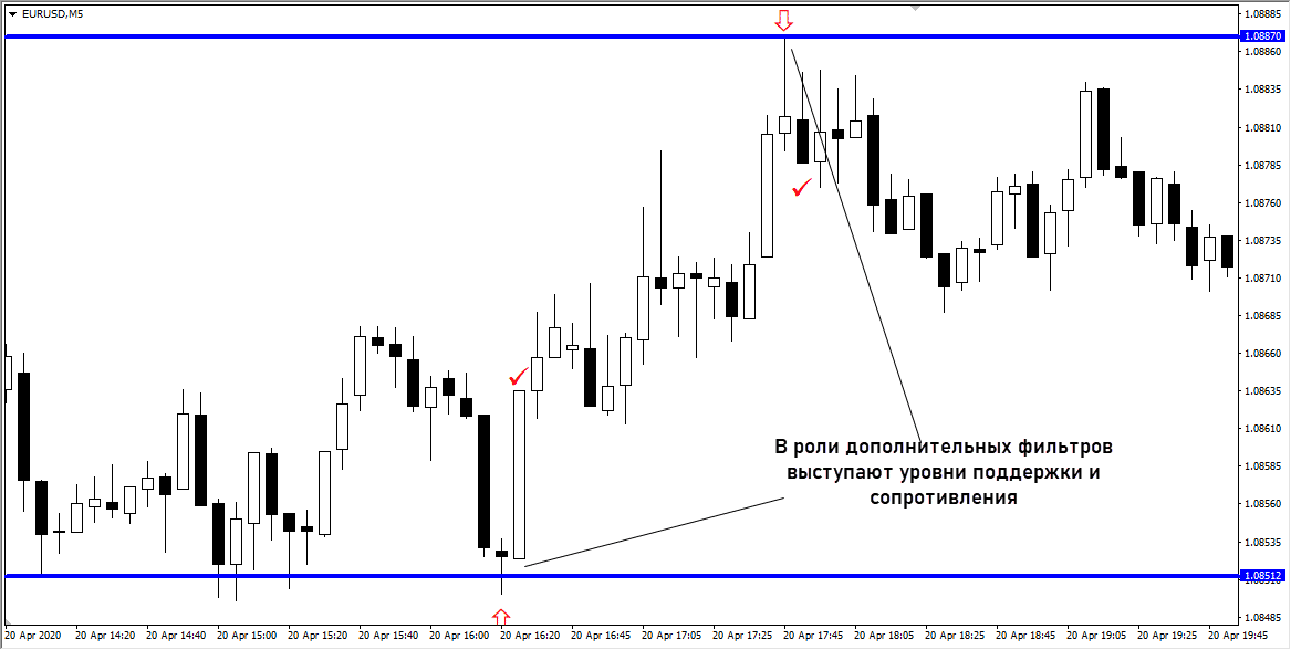 - дополнительно можно фильтровать сигналы уровнями поддержки и сопротивления.