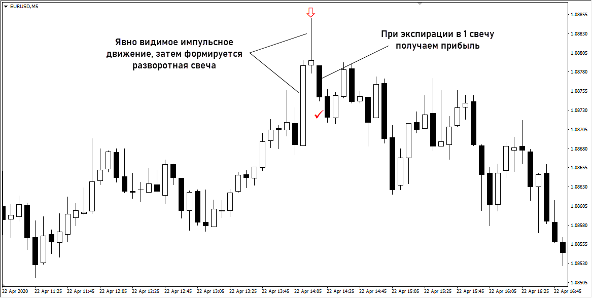 - экспирацию всегда выставляйте равной 1 свече. Откаты после импульсов редко бывают продолжительными;