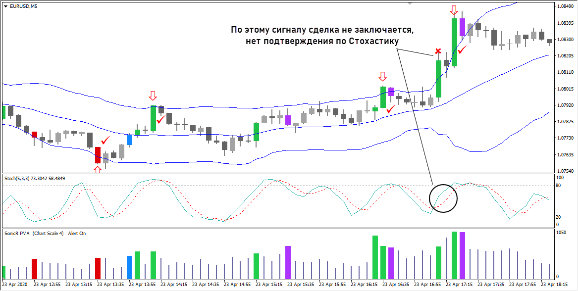 Помимо ВВ и Стохастика в системе используется пользовательский индикатор для отображения тиковых объемов – Sonic_6 PVA Volumes и схожий инструмент для выделения особо важных свечей – Sonic_2 PVA Candles. Они взяты из другой стратегии, на цвета свечей можно не обращать внимание, достаточно того, что по свечам можно понять где именно произошел всплеск объемов.
