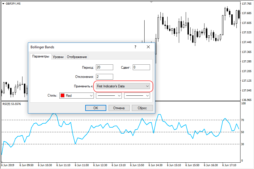 Необычность подхода в том, что ВВ строятся по показаниям индикатора RSI, а не по ценовому графику. Для этого в МТ4 нужно перетянуть индикатор ВВ на окно RSI и в окне «Применить к» выбрать не тип цены, а First Indicator’s Data.