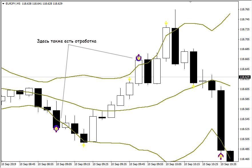 Расчет сделан на то, что эти значения график достигает только при сильных движениях, а после них неизбежно следует хотя бы небольшой откат. Его мы и пытаемся взять, экспирация в этой ТС равна 1-2 свечам, а работать предлагается на М1-М5. На больших временных интервалах сигналы будете получать очень редко.