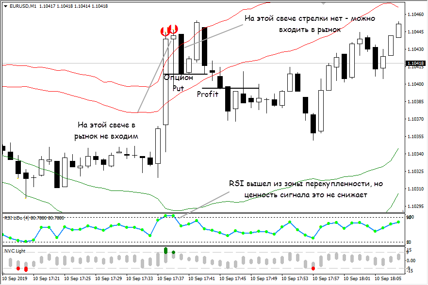 - если на следующей свечке не формируется стрелка, можно торговать;