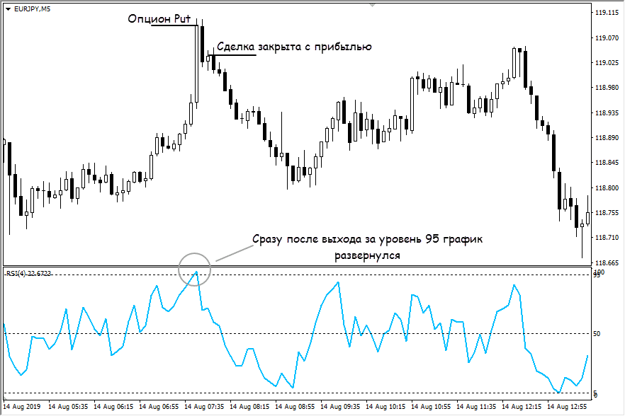 Одна из простейших торговых систем для бинарных опционов, кроме RSI в ней не используются иные индикаторы. В осцилляторе нужно задать положение границ зон перекупленности и перепроданности на отметках 95 и 5.