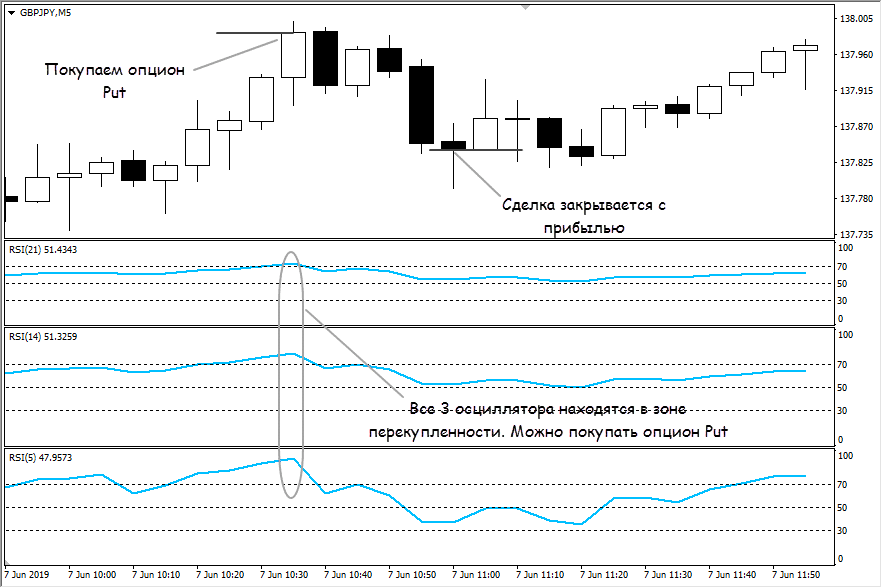 Для работы понадобятся 3 RSI с периодами 21, 14 и 5. Для входа в рынок нужно дождаться входа линий всех трех осцилляторов в зону перепроданности (покупается опцион Call) или перекупленности (работаем с опционами Put). Срок экспирации 5-7 свечей, ограничений по валютным парам нет, работать лучше всего на 5-минутном временном интервале.