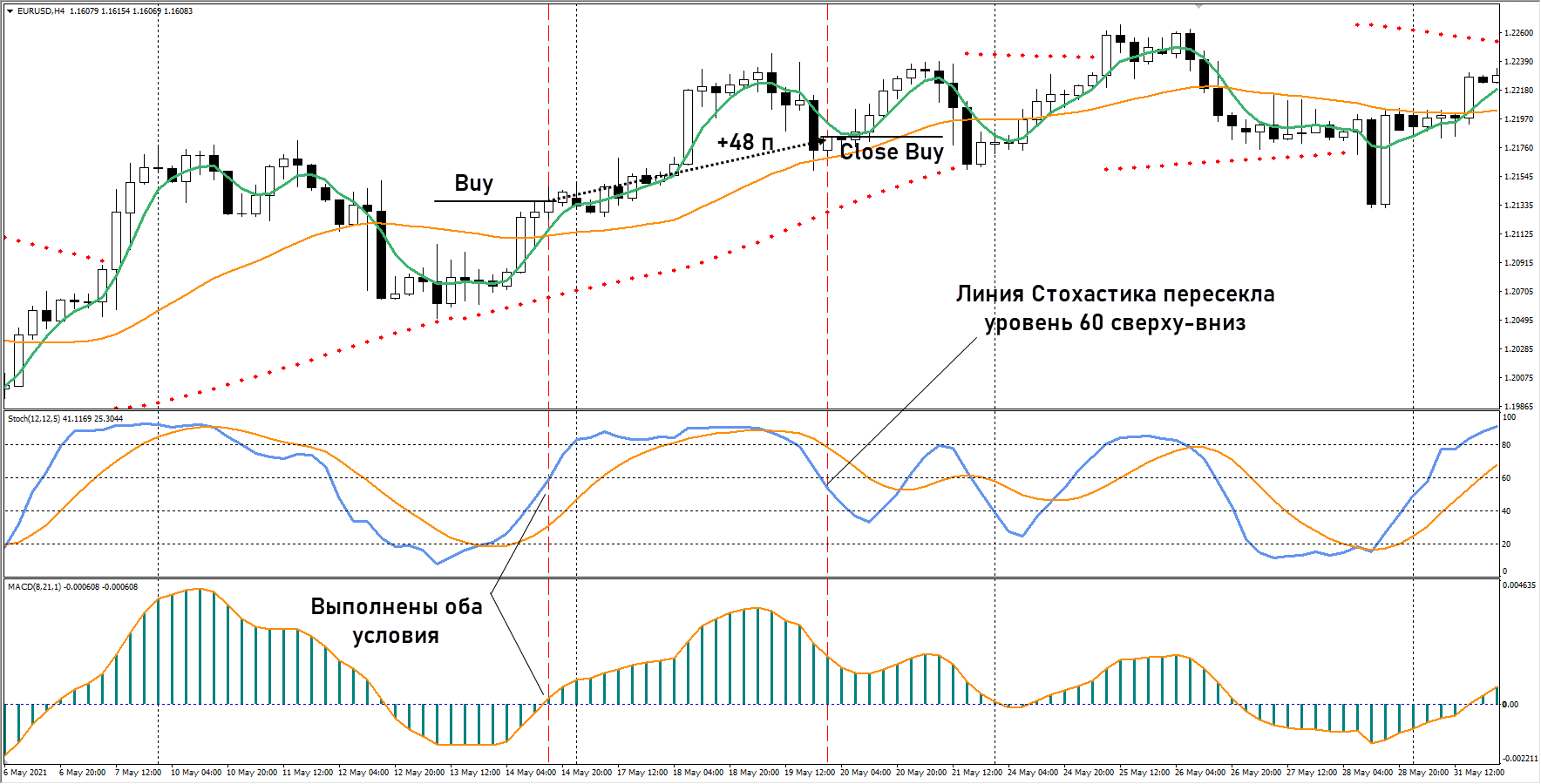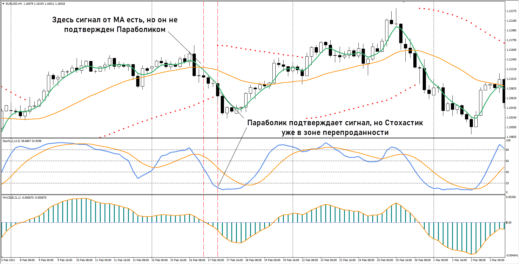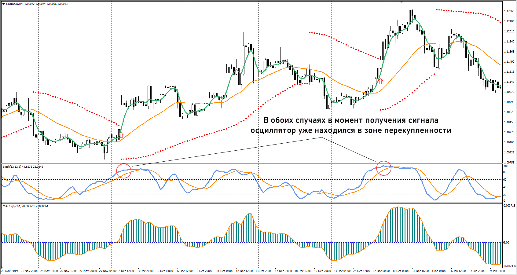 Правда, в большинстве случаев такие ситуации не дают сигналов на вход в рынок. К моменту, когда Параболик подтверждает Стохастик уже входит в зону перепроданности/перекупленности и вероятность отработки сигнала снижается.