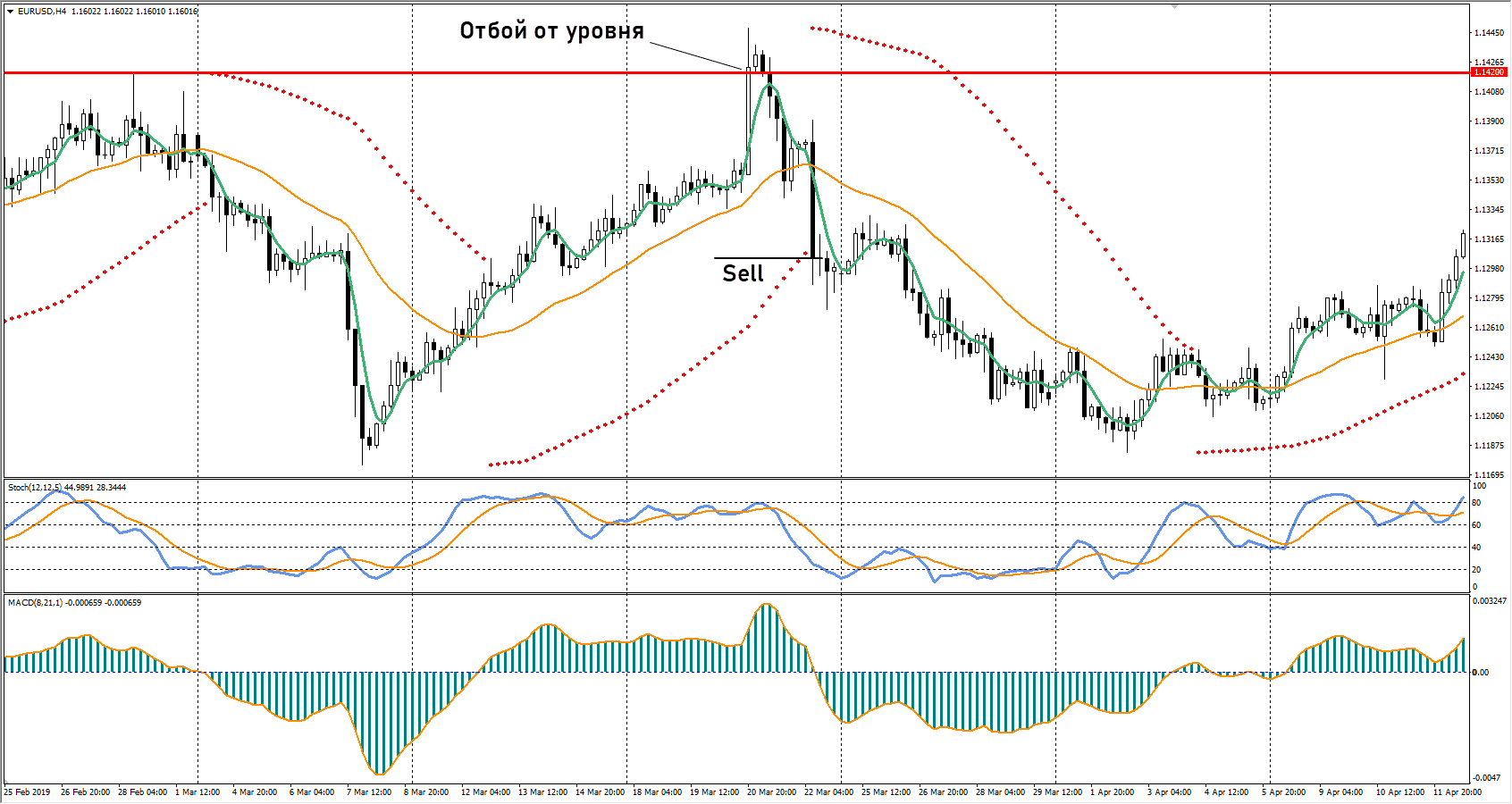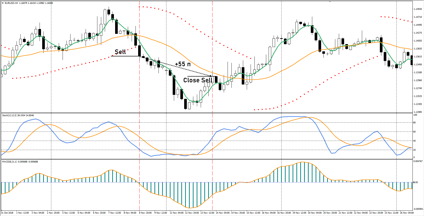 Что касается сделок на продажу, то правила меняются зеркально. Быстрый мувинг должен пересекать медленный сверху-вниз, Параболик при этом должен быть над графиком, а Стохастик – выходить из зоны перекупленности. Гистограмма MACD должна пересекать нулевой уровень сверху-вниз.
