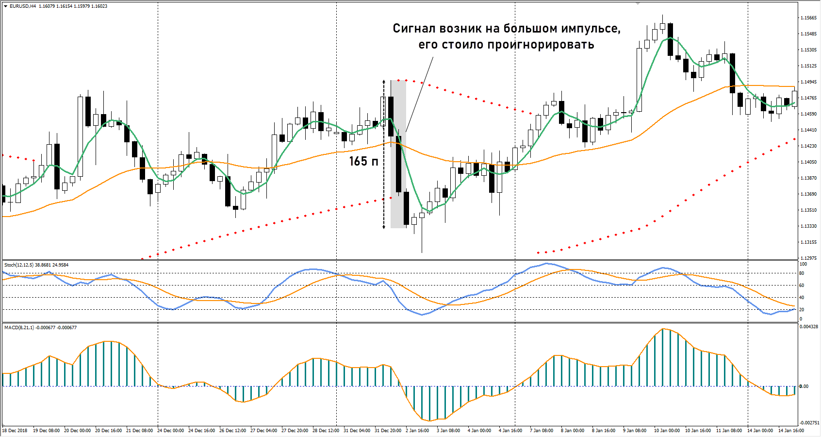 - Если пересечение МА происходит на импульсном движении, то несмотря на формальное выполнение условий точка входа может оказаться невыгодной. К моменту получения сигнала график уже проходит значительное расстояние, скорее всего в ближайшем будущем начнется откат. В базовой версии правил на этот случай указаний нет, можно посоветовать сравнивать размер импульса со средней дневной волатильностью. Если он превышает ее в 2-3 раза, то лучше проигнорировать сигнал или дождаться коррекции.
