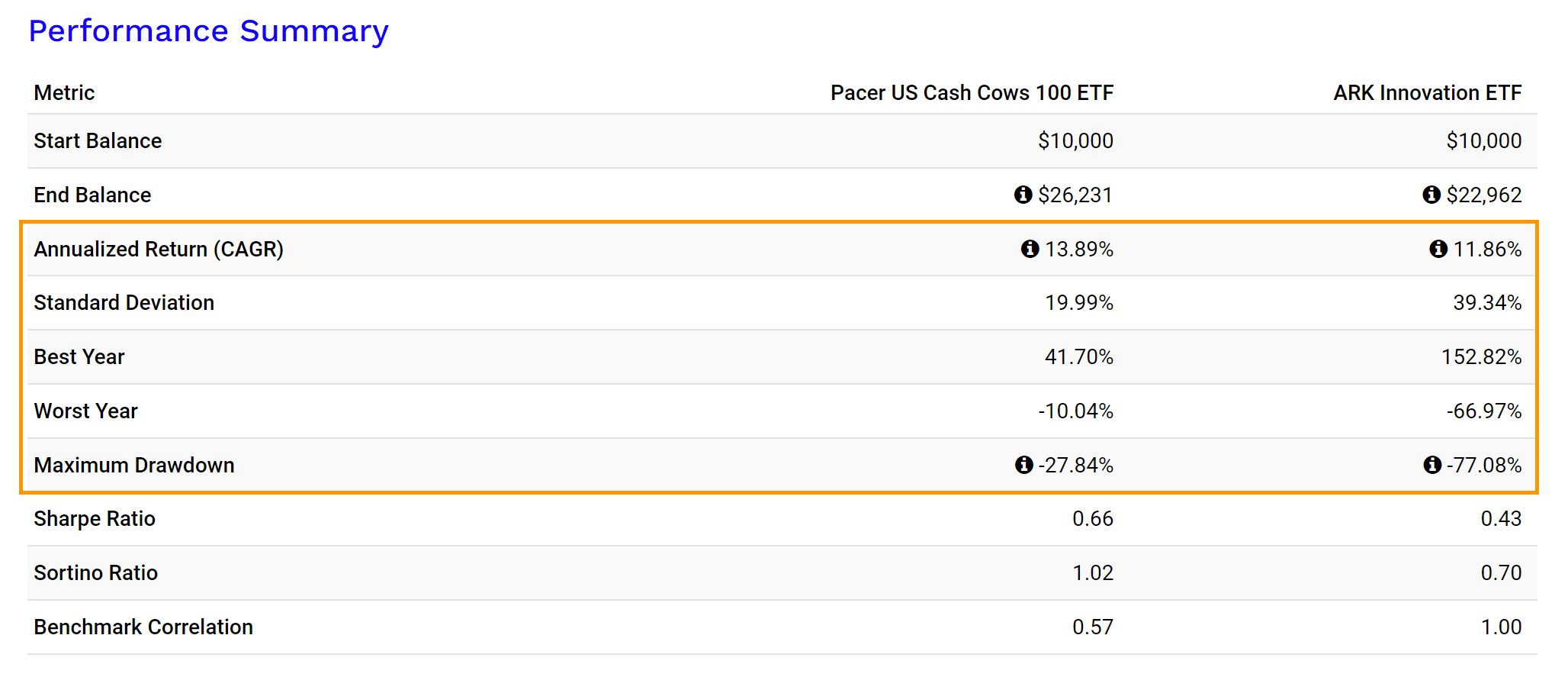 Несмотря на малый временной промежуток теста, это обусловлено сроками запуска ETF, сравнение показывает преимущество Cash Cows. Дойные коровы обеспечивают стабильность и низкую волатильность доходности. На период теста пришелся кризис, связанный с коронавирусом, но даже в таких условиях Pacer US Cash Cows 100 неплохо себя чувствовал, чего нельзя сказать об агрессивном портфеле.