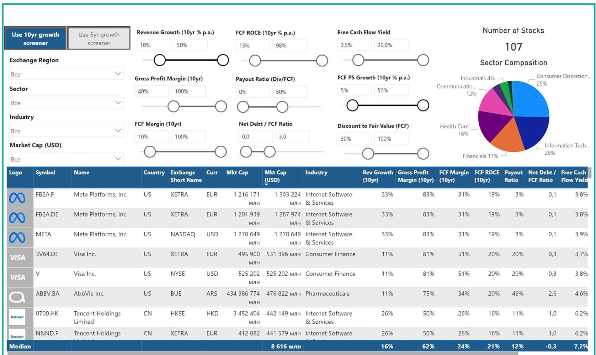 - Revenue Growth (10 y) > 10%. За последние 10 лет годовой рост выручки должен превышать 10%.