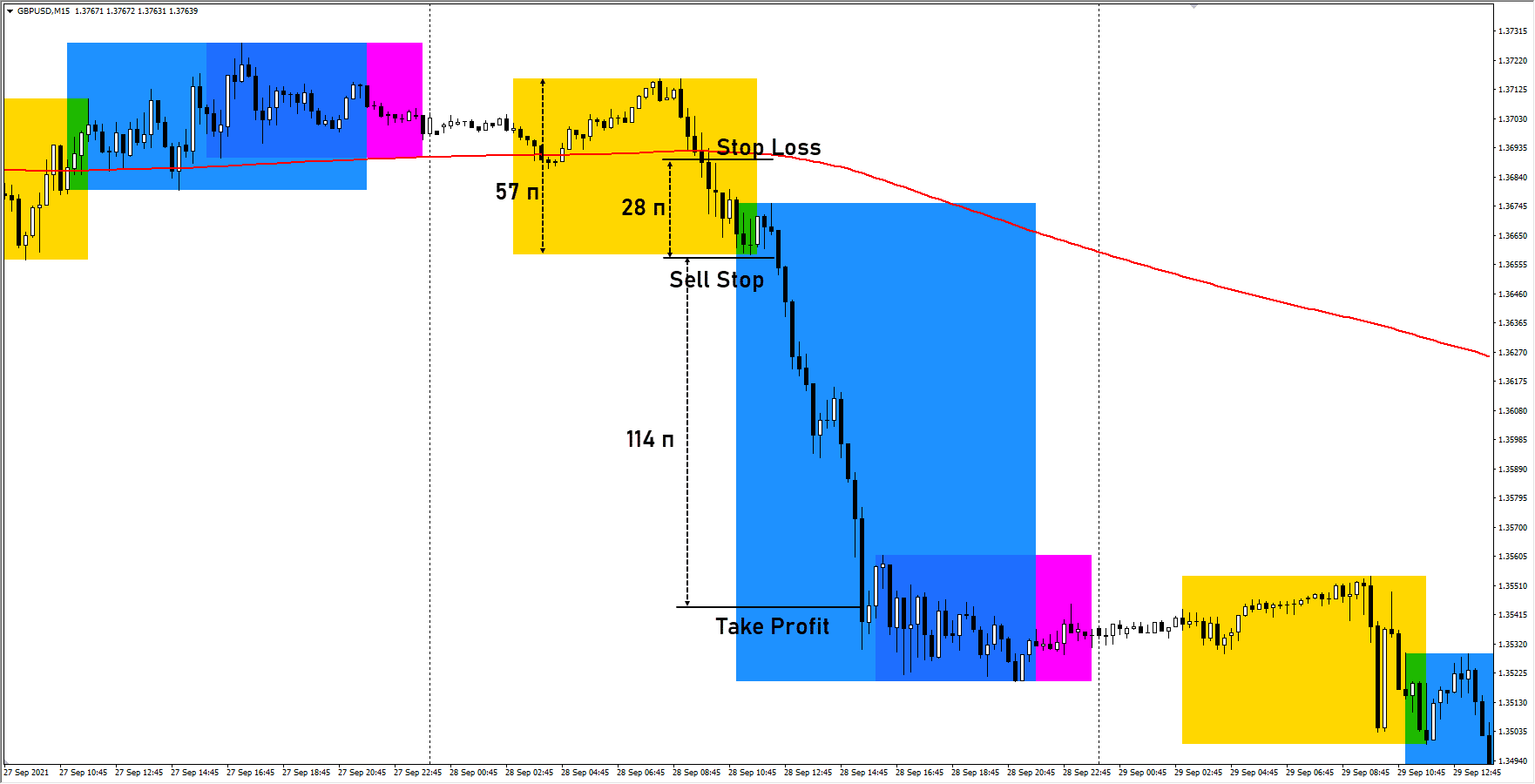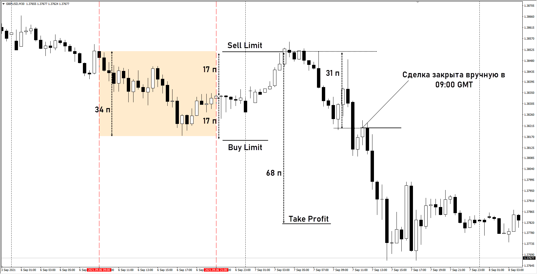- Ордер Sell Stop размещается под нижней границей диапазона.