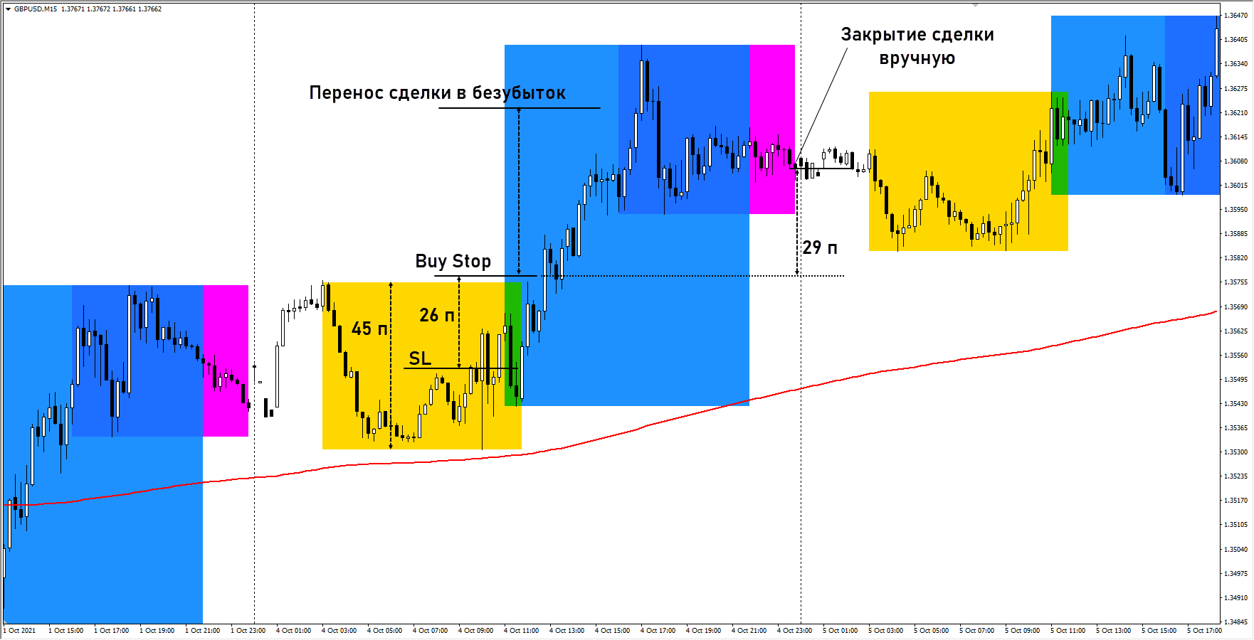 В этой модификации используется индикатор i—Sessions для выделения торговых сессий и «тяжелую» скользящую среднюю с периодом 365. Работа ведется только отложенными ордерами, эту ТС стоит записать в пробойные стратегии.