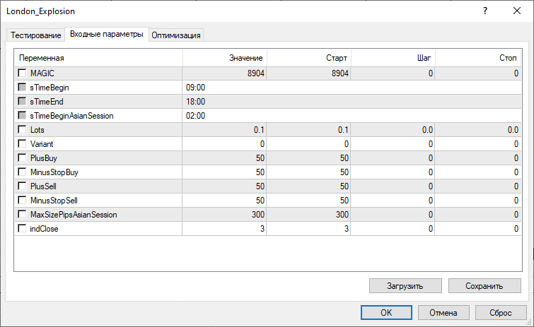 Для проверки ТС был выбран бесплатный советник London Explosion, он основан на ТС первого типа. В настройках можно откорректировать любой из параметров: