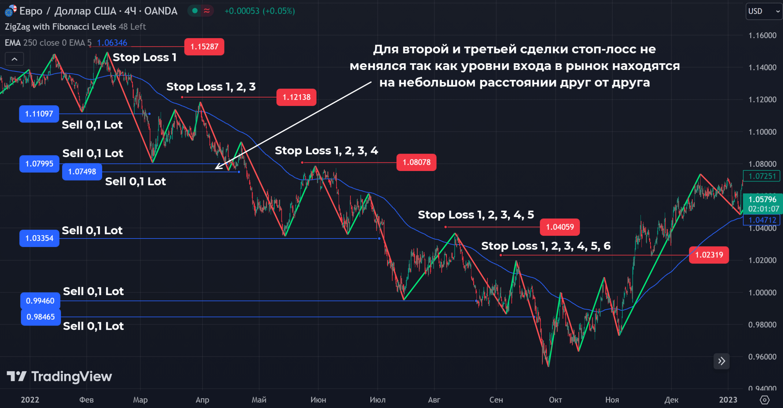 Суть методики сводится к тому, что при возникновении очередного сигнала по тренду предыдущая сделка не закрывается. Вместо этого открывается еще одна позиция в том же направлении. Стоп-лосс чаще всего устанавливается на один уровень для удобства сопровождения сетки сделок.