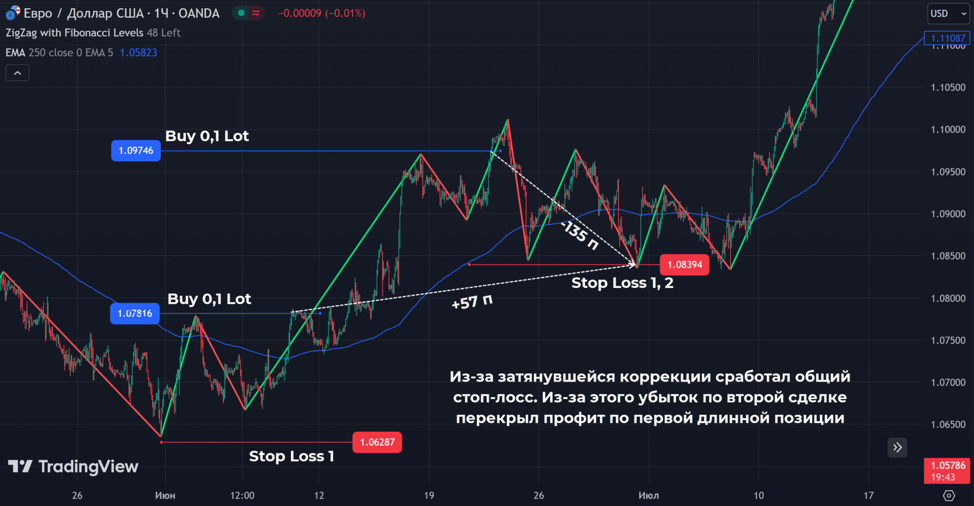 В примере ниже трейдер успел открыть только 2 сделки. После второй покупки началась глубокая коррекция и сработал стоп-лосс. Итоговый результат 57 – 135 = -78 пунктов. Пирамидинг стал причиной небольшого убытка.