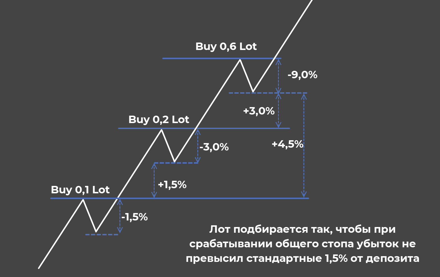 Нет ГОСТа, в котором бы давались жесткие рекомендации по реализации этого подхода к торговле. Пирамидинг гибок, вы можете настроить изменение объемов и положения SL так, чтобы при максимально невыгодном положении выходить в ноль. Можно сделать акцент на риске и кратно увеличивать лот на каждом новом уровне, сохраняя теоретический убыток на стандартном уровне. Можно работать без увеличения лота, защищая прибыль и выжимая максимум из каждой трендовой волны.