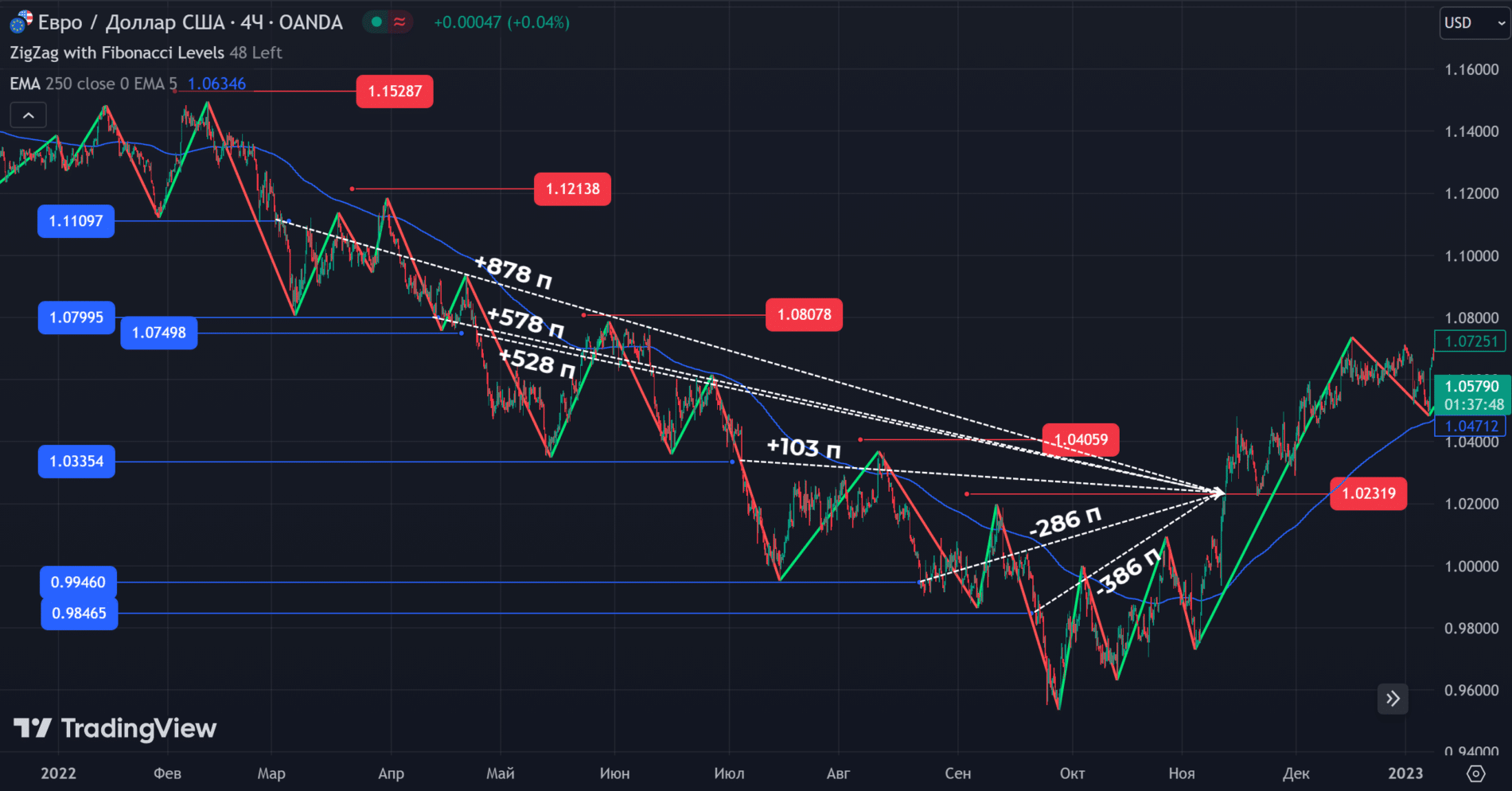 Эту тактику можно объединить с большей частью трендовых стратегий. В примере использовался подход с фильтрацией направления движения графика по скользящей средней. Сделки заключаются при пробое экстремума зигзага.