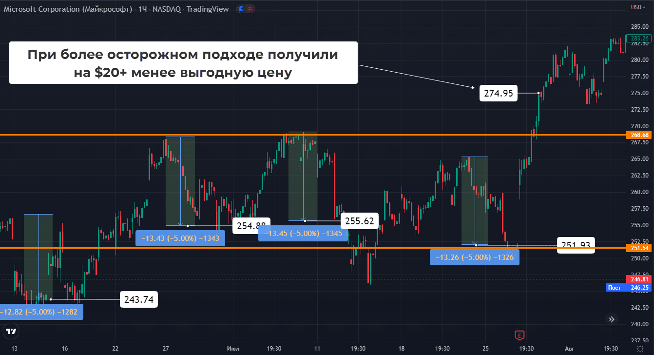 Фильтр подбирается индивидуально. Можно, например, покупать акции как только они снизятся на 4-10%, все зависит от волатильности конкретной бумаги. За счет этого средняя цена для всего объема будет ниже, чем если бы инвестор дожидался подтверждения продолжения восходящего движения или пытался купить на самом дне.