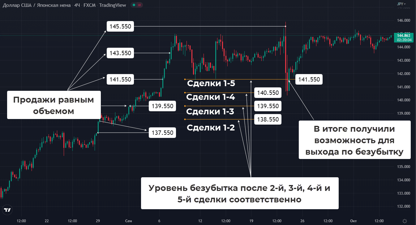 - Коррекция была, но до 140,55 она не дошла. Зато при очередной попытке роста открыта еще одна сделка на продажу по цене 145,55. Безубыток сместился на 141,55 и здесь можно было закрыть всю сетку ордеров.
