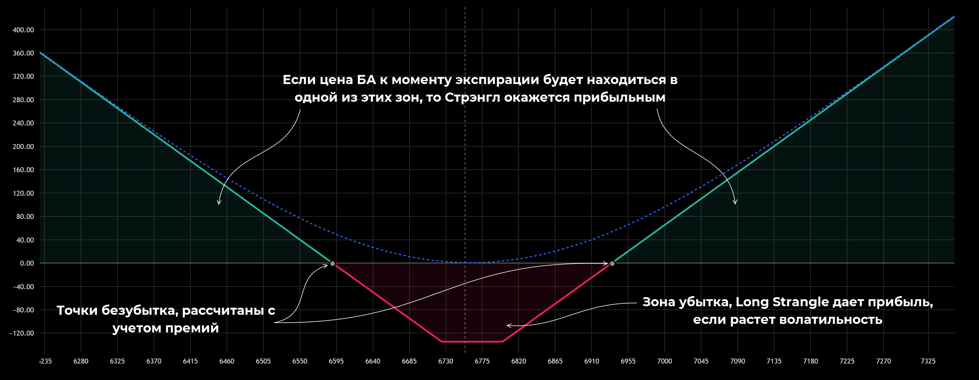 Strangle можно рассматривать как Стрэддл, у которого страйки опционов не равны друг другу. Это несколько меняет логику построения позиции, но общий принцип остается – заработок на росте/падении волатильности базового актива.