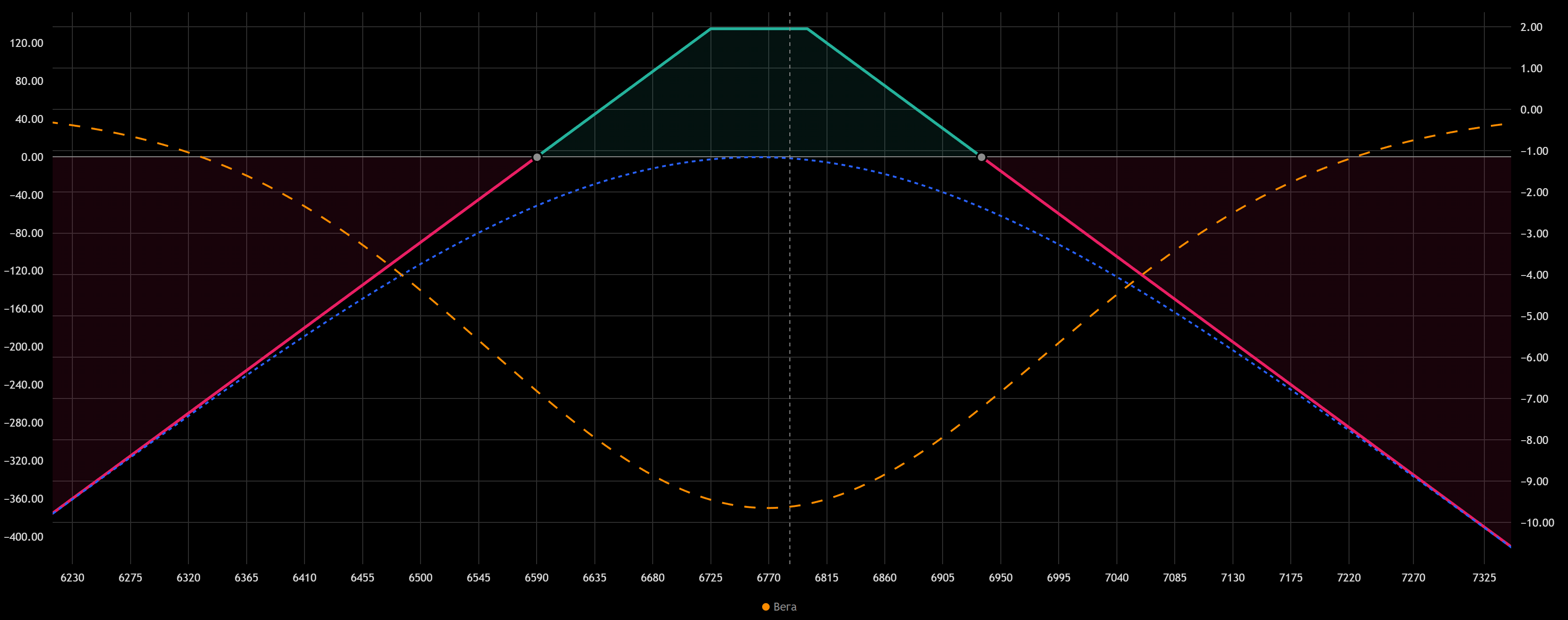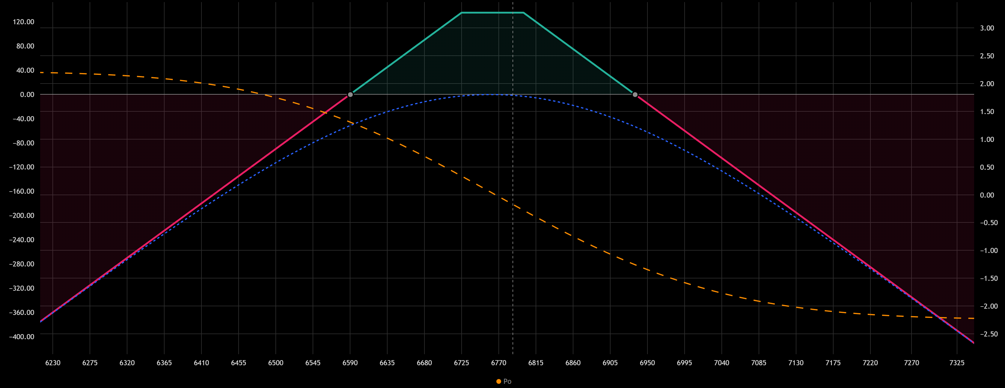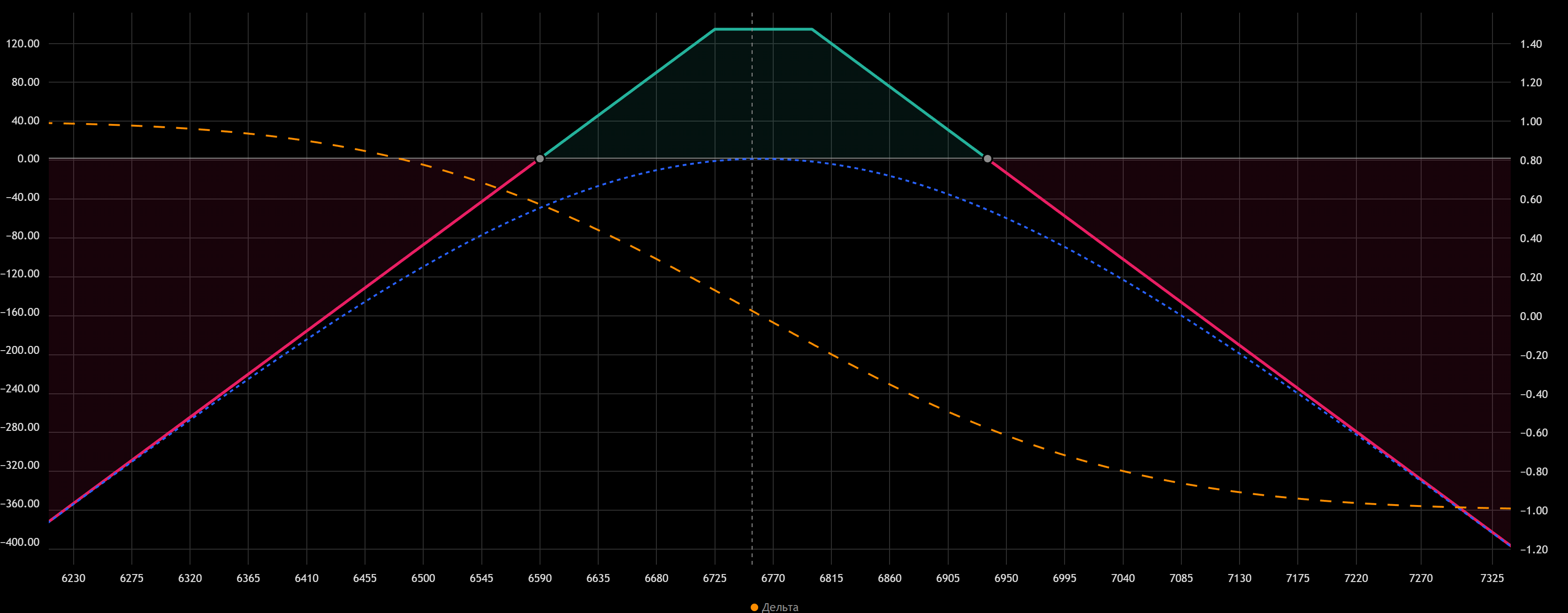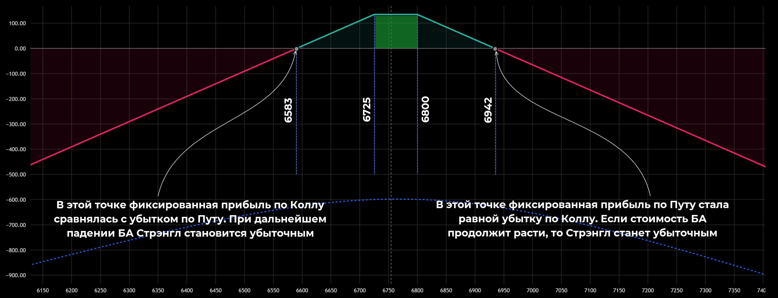 - Для определения точек безубыточности нужно добавить суммарную премию к страйку по Коллу и вычесть премию из страйка по Путу. Верхняя точка безубыточности 6800 + 134,75 = 6934,75, нижняя точка – 6725 – 134,75 = 6590,25.