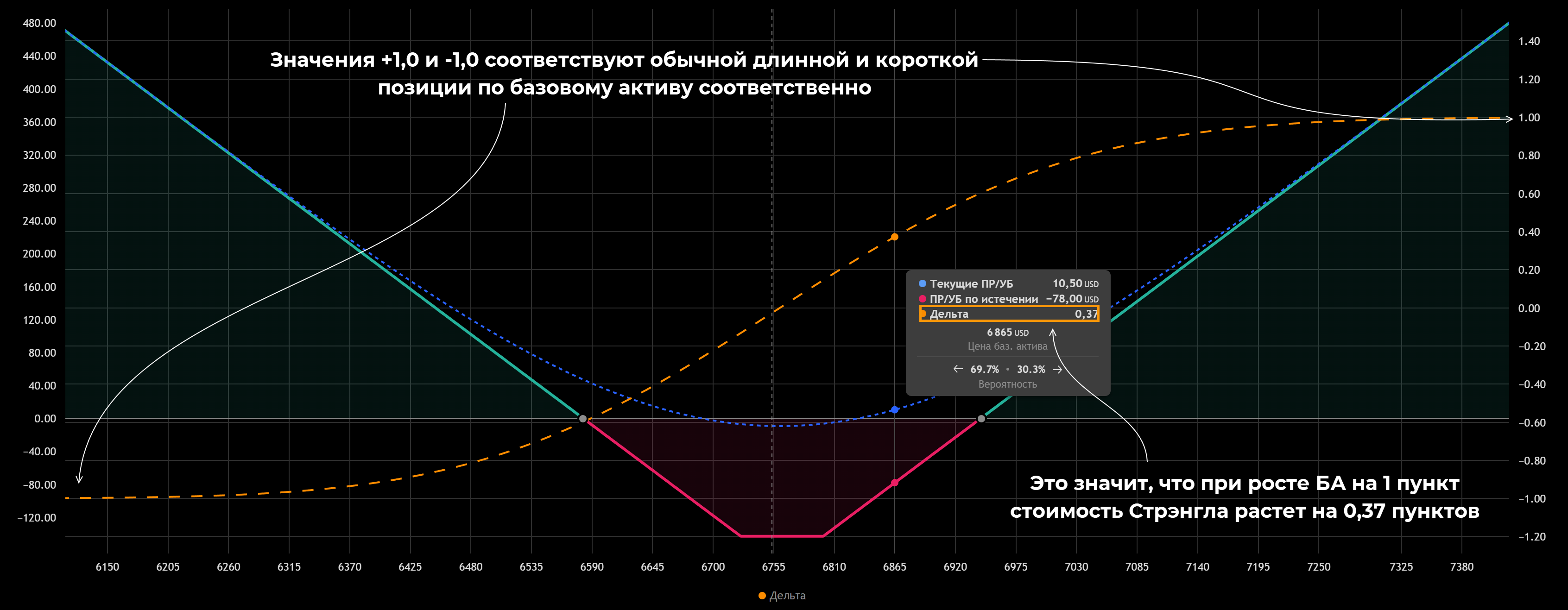 - Дельта. Показывает как Стрэнгл опционы реагируют на изменение стоимости базового актива. Если дельта равна 1,0, то Стрэнгл эквивалентен покупке БА, -1,0 соответствует продаже БА. Значение дельты, например, 0,37 означает, что при росте БА на 1 пункт позиция подорожает на 0,37 пункта. С отрицательной дельтой логика та же, просто теперь держатель Стрэнгла зарабатывает на падении БА.