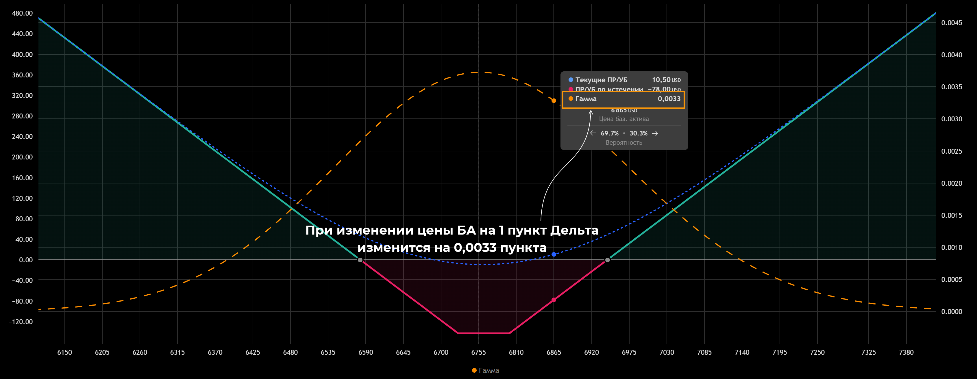 - Гамма. Форма та же, что у Long Strangle, но кривая перевернута. Это указывает на то, что изменение стоимости БА играет против продавца Колла и Пута.