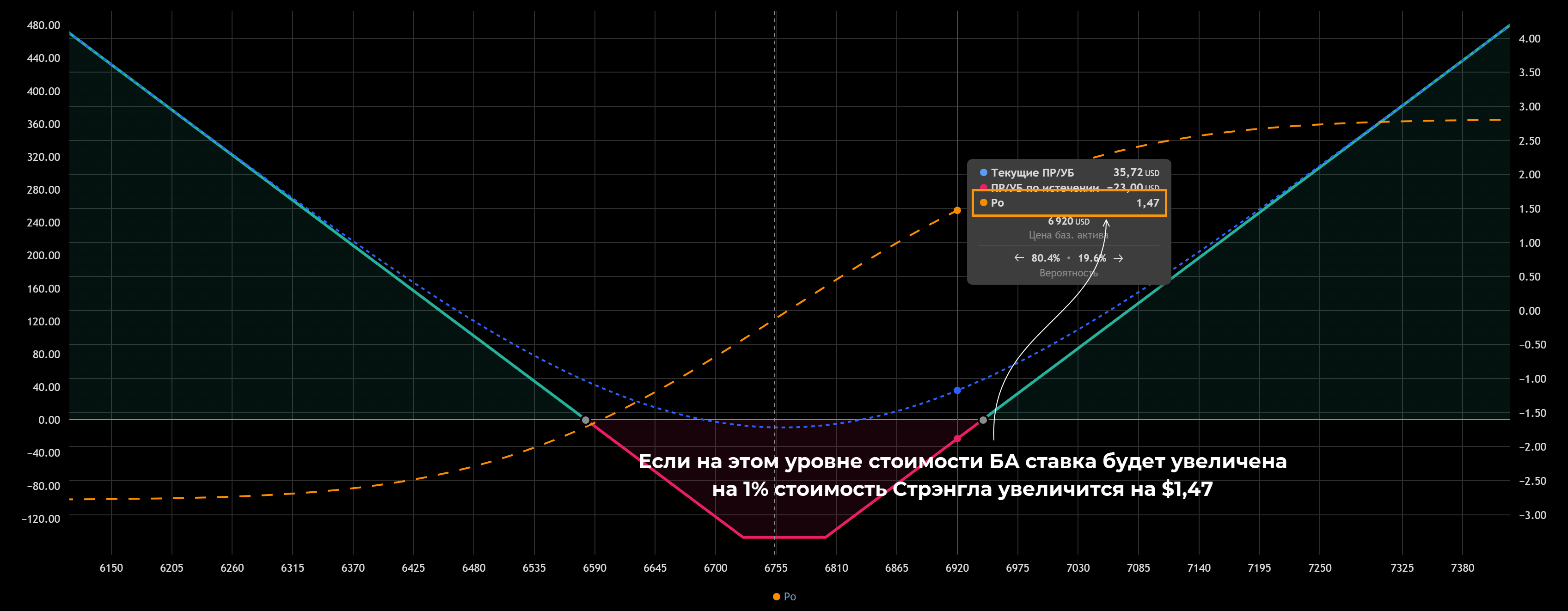 Вега дает количественную оценку этого фактора. Конкретное число грека можно трактовать как изменение стоимости Стрэнгла при изменении IV на 1%.