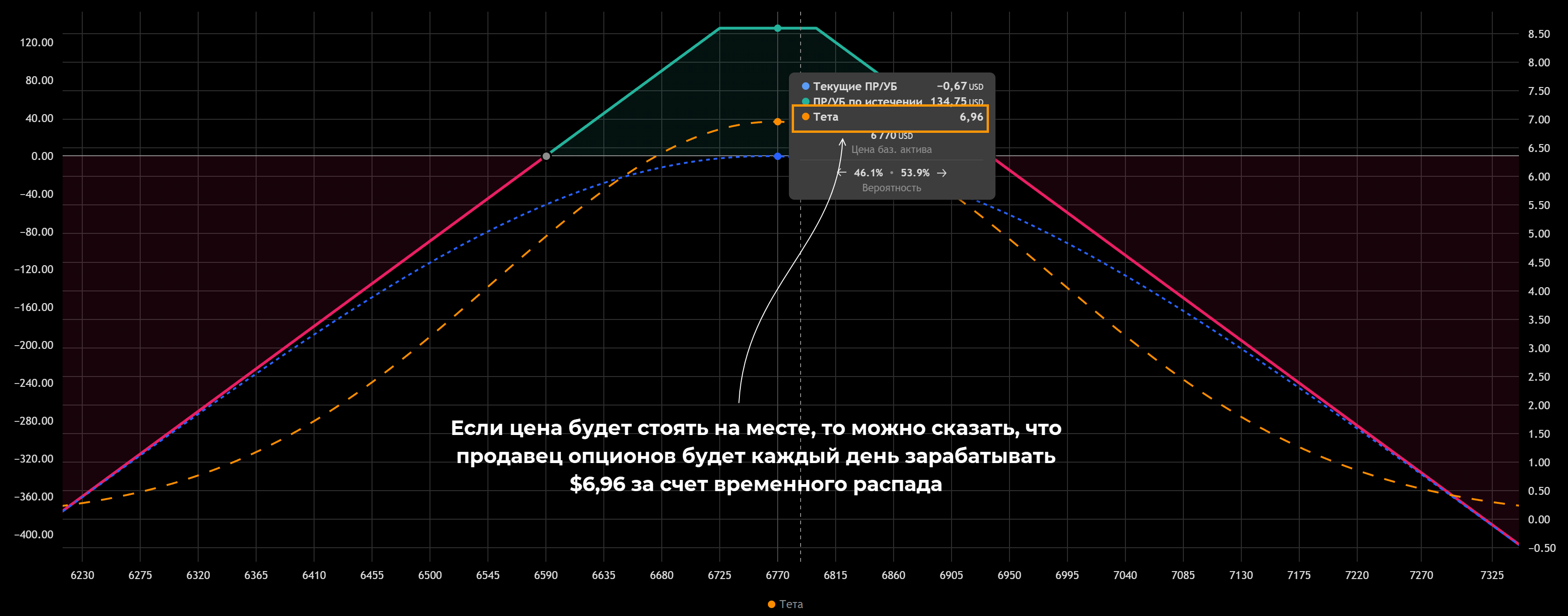 - Если цена останется в коридоре между 2 экспирациями (6725 — 6800), то продавец заработает $142.