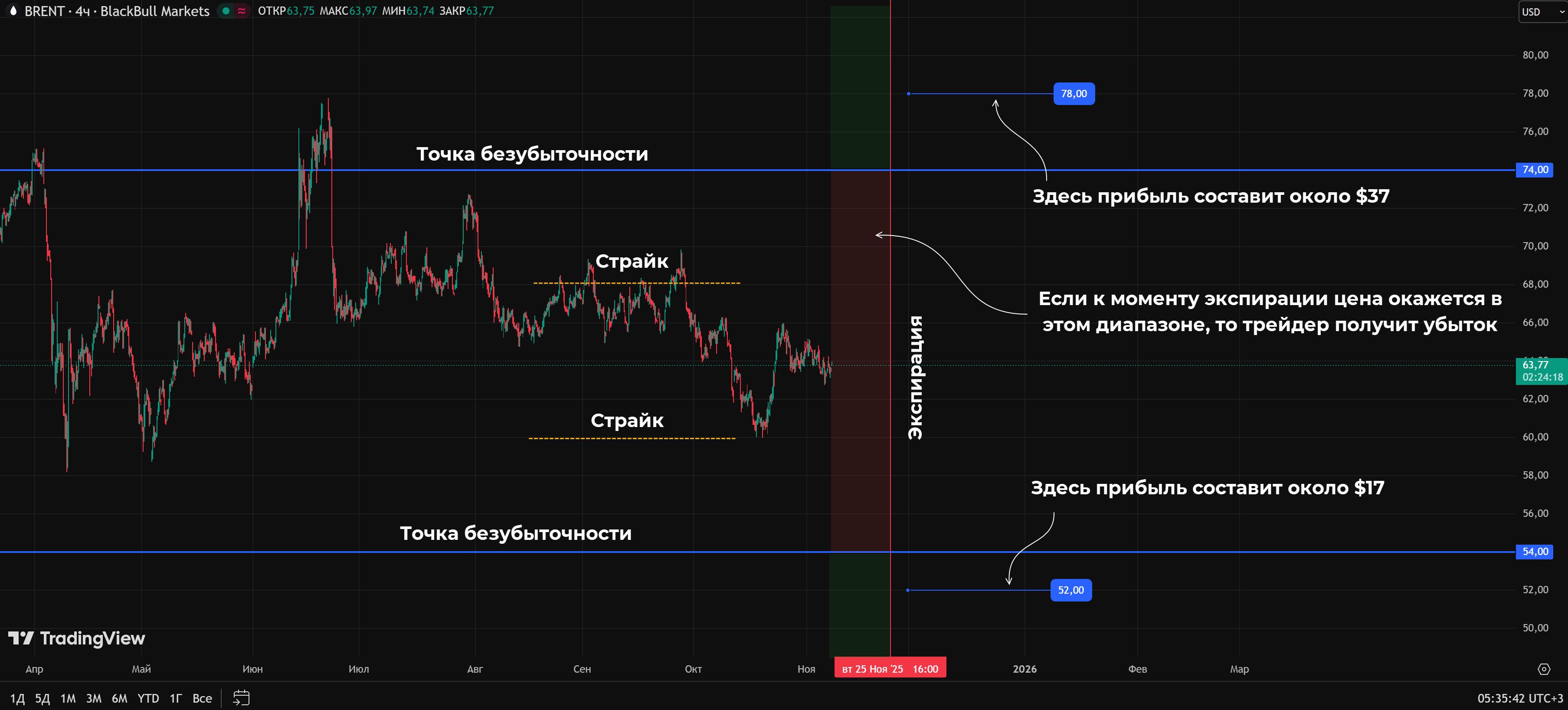 - С учетом этого точки безубыточности находятся на отметках 68 + 6 = $74 и 60 – 6 = $54. Для заработка стоимость нефти должна либо упасть ниже $54, либо вырасти до отметки $74+.